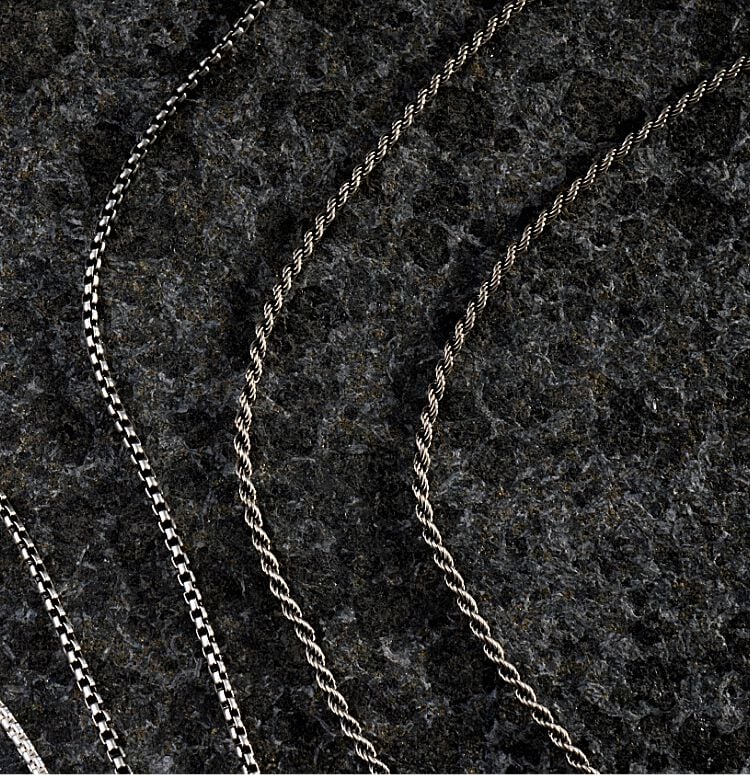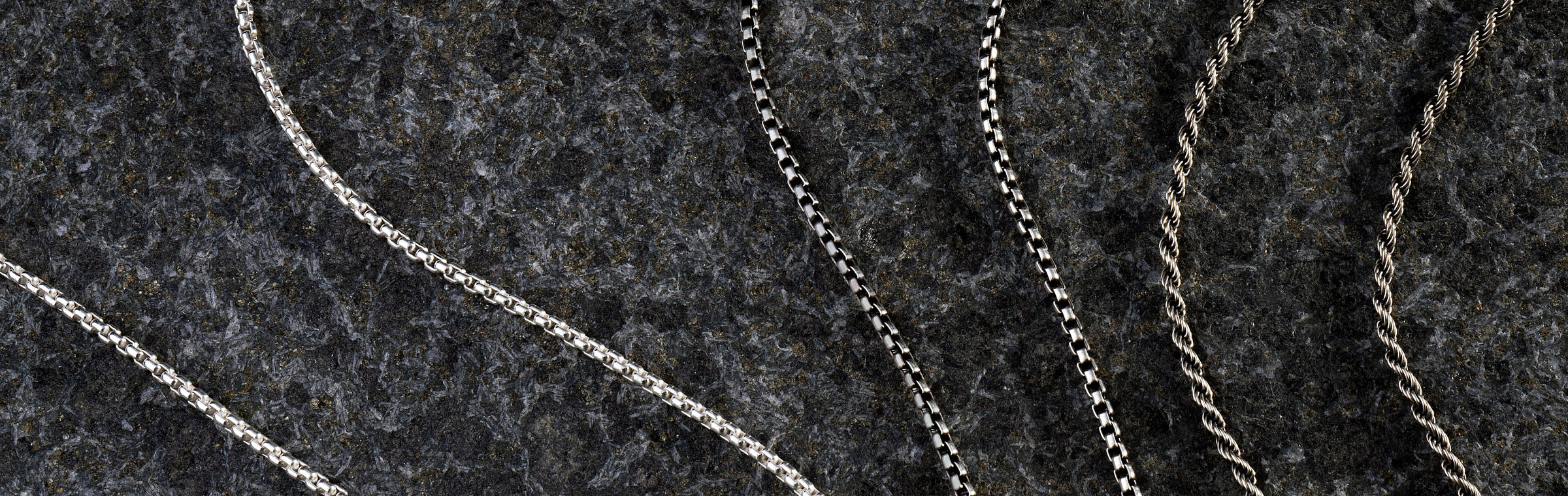 Chains – Options include belcher, anchor, cord, and Venezia chains, available in various lengths and finishes.