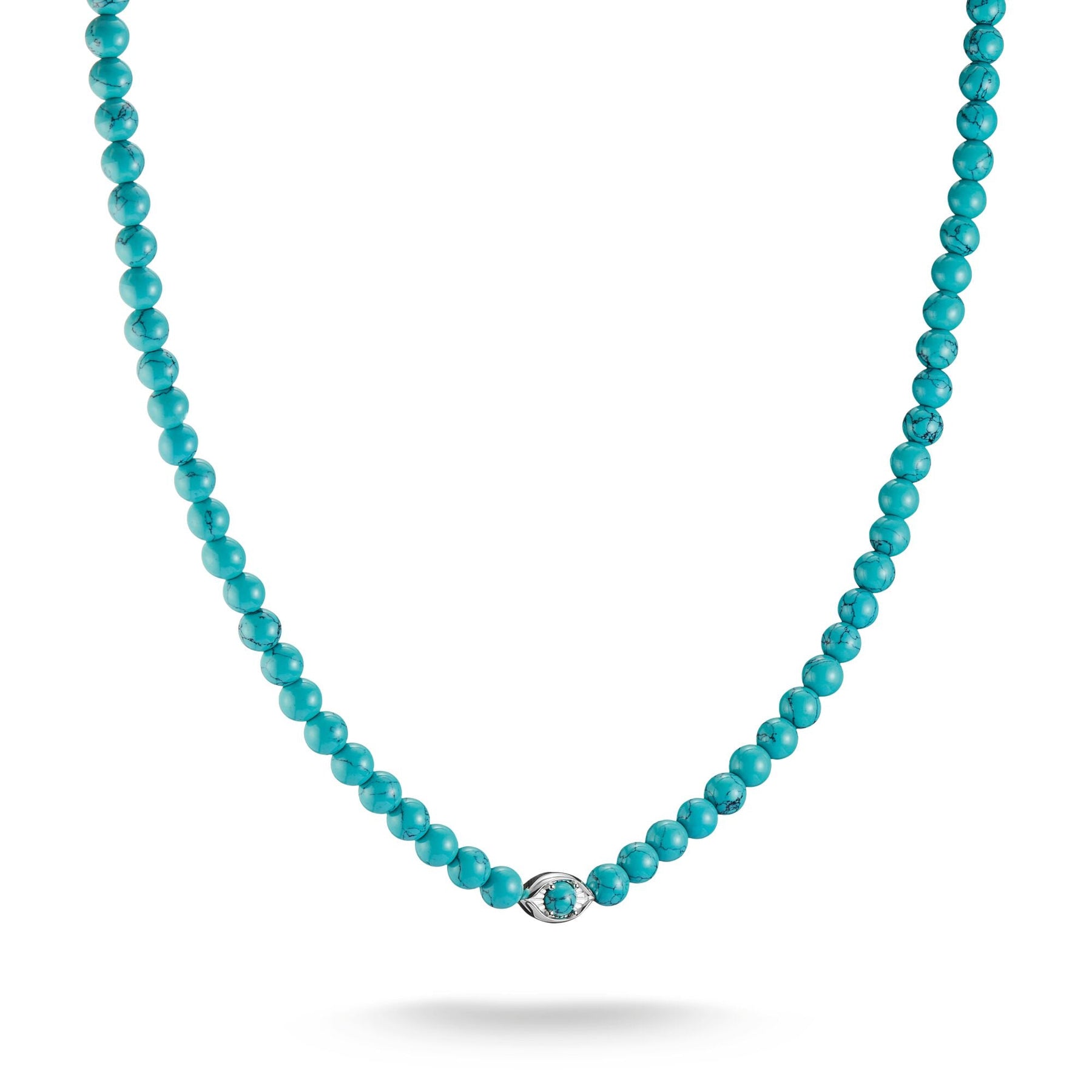 A silent symbol of protection and charisma: this bead chain made from polished, imitation turquoise combines depth and symbolic power. In the centre sits a detailed silver element in the shape of an eye - set with another turquoise stone as a radiant centrepiece. Part of the Elyndra collection - for inner balance, personal strength and stylish presence.