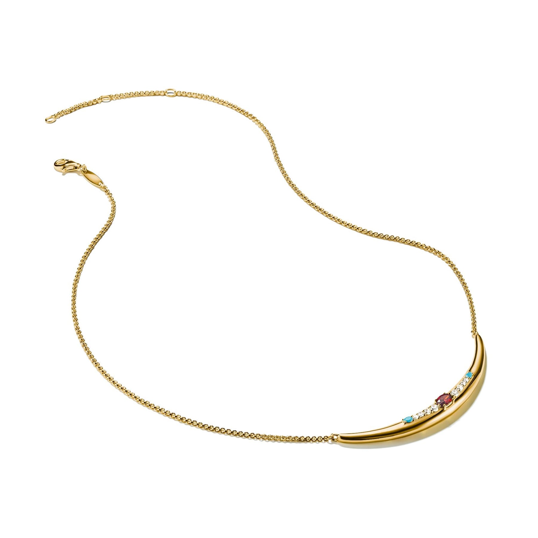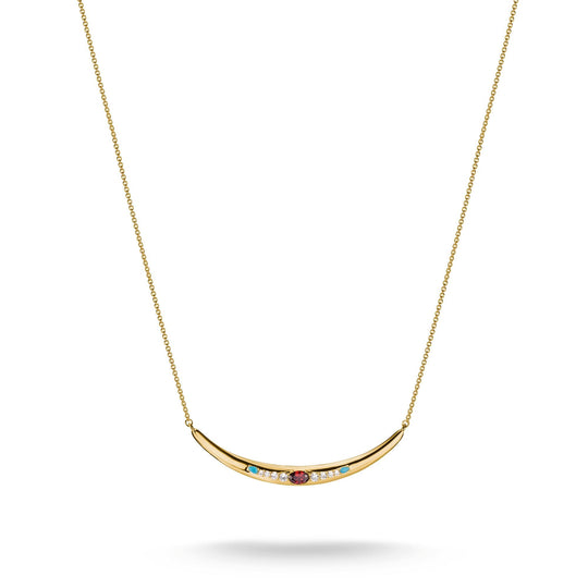 This necklace made from recycled 925 silver with elegant 18k gold plating clings to your décolleté like an arc of light and energy. The firmly crafted centrepiece in a rounded half shape features a finely set row of stones: a garnet red zirconia in an oval cut in the centre, flanked by white zirconia stones and turquoise accents. The colour gradation is reminiscent of movement, focus and inner balance - a piece of jewellery that radiates depth and lightness at the same time. Part of the Elyndra collection. Length: 45 cm, can be individually adjusted using the extension chain.