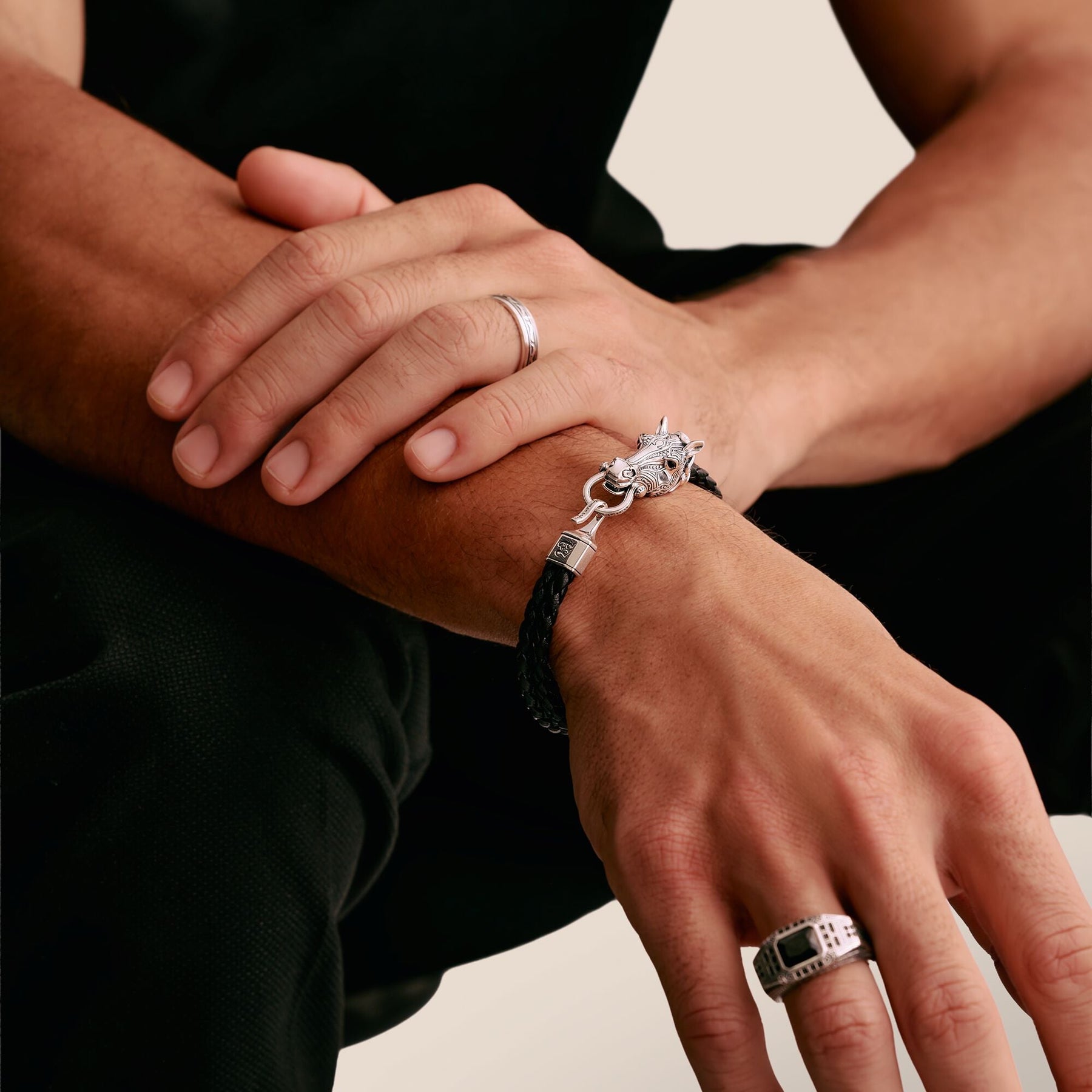 This bracelet brings together rebellious spirit and high-quality materials. The 4 mm thick black leather strap meets a detailed clasp made of blackened 925 sterling silver, decorated with sparkling black zirconia and onyx. The mix of channel and prong settings gives the design extraordinary depth and structure. With a length of 19 cm, the bracelet sits comfortably on the wrist and can be worn solo or layered with other pieces. A powerful accessory for anyone who wants to express their style with confidence.