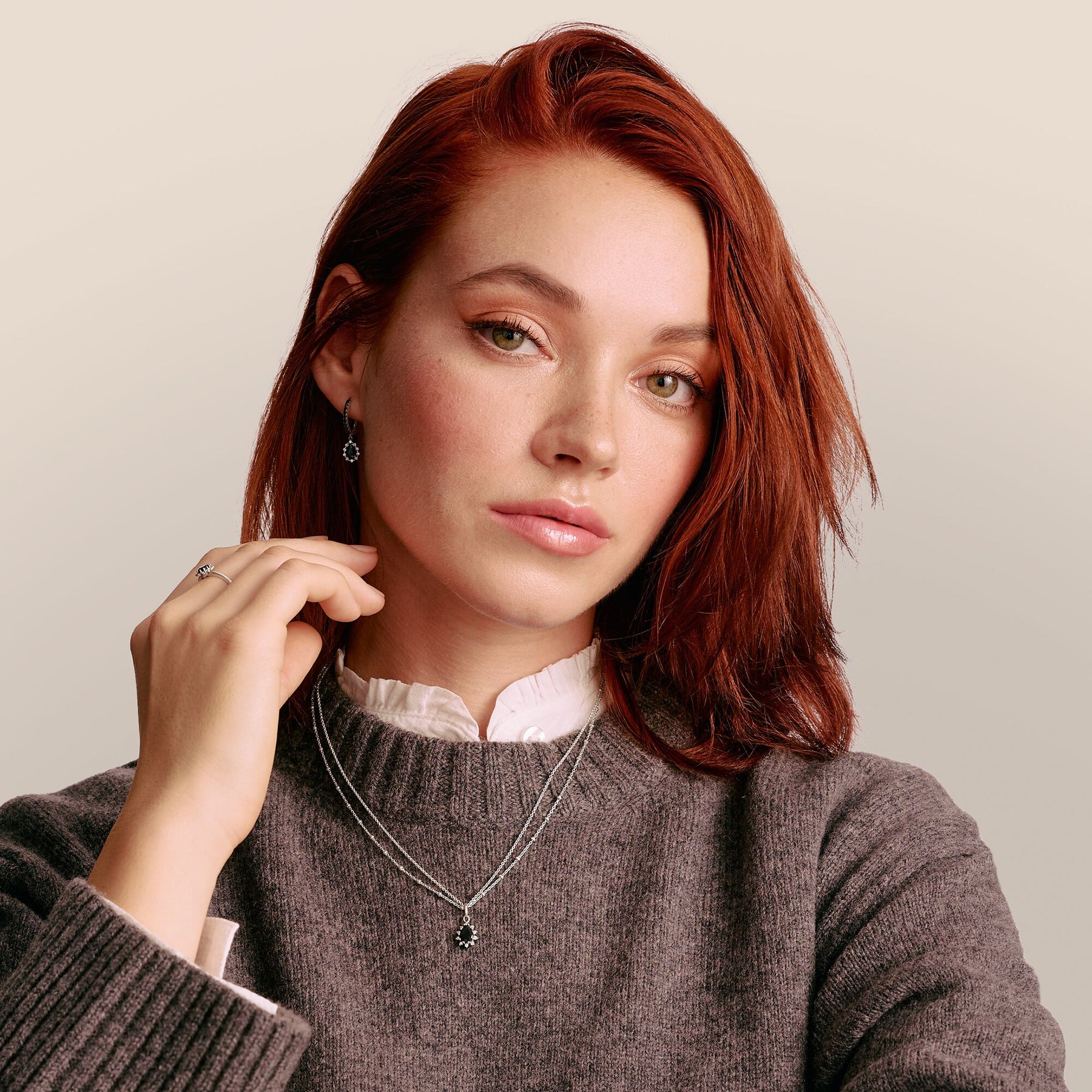 A touch of Victorian drama: this delicate necklace features a dark, faceted stone in an intricate setting that evokes stories of love past. Crafted from recycled 925 silver with a blackened finish, the pendant is framed by delicate details and sparkling accents. A necklace that combines timeless elegance and mystical charm, it can be worn alone or combined with other pieces.