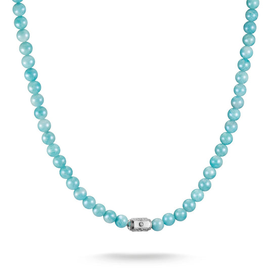 This necklaces made of round polished amazonite beads accompanies you with the calm power of inner balance. In the centre: a richly decorated silver clasp with lucky symbols such as a star, crescent moon, eye and horseshoe - complemented by the THOMAS SABO and LUCK engravings. Part of the Elyndra collection - as a power necklace for balance, serenity and stylish self-determination.