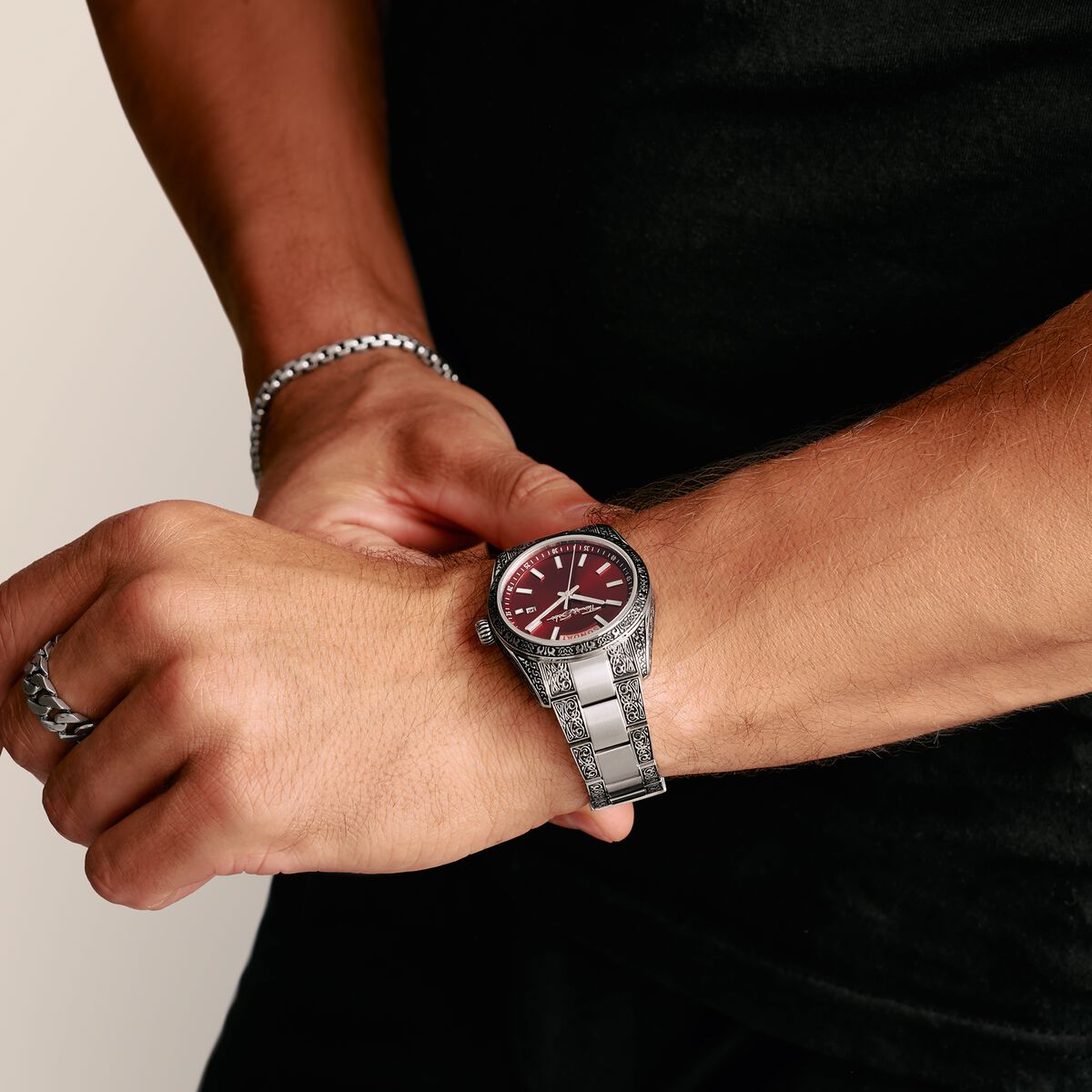With its expressive design, this Rebel at Heart watch is a must-have for all fashionistas. The tattoo-look pattern on the bezel and the outer bracelet links with a mix of geometric style elements and acanthus leaf ornamentation make this timepiece a unique wrist accessory. The red dial is decorated with silver-coloured, raised indices and also displays the day of the week and date. The hour hands and indices glow in the dark. More than just a watch - a fashion statement and a tribute to personal style.