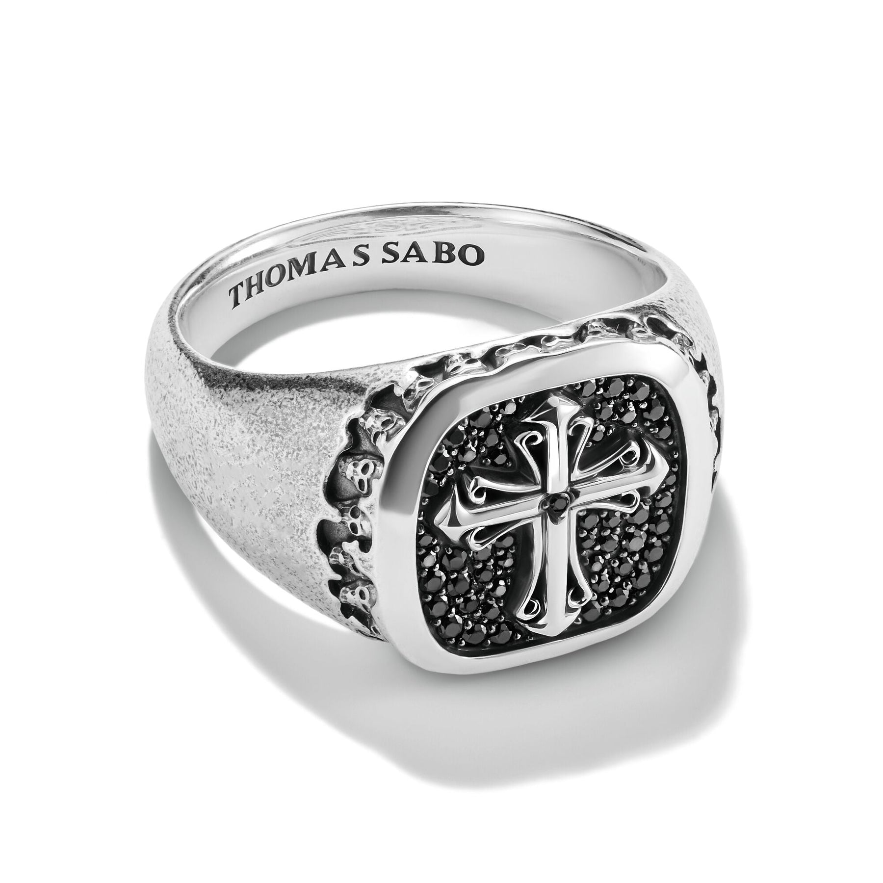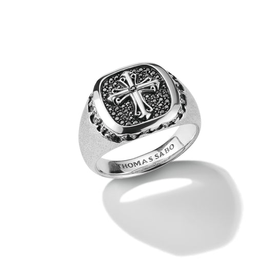 A powerful statement of rebellion: a sculptural cross is embedded in a deep black pavé of zirconia – framed by striking, integrated skulls and a rough textured surface. The blackened silver aesthetic and striking design language make this signet ring a rebellious symbol of attitude and style consciousness.