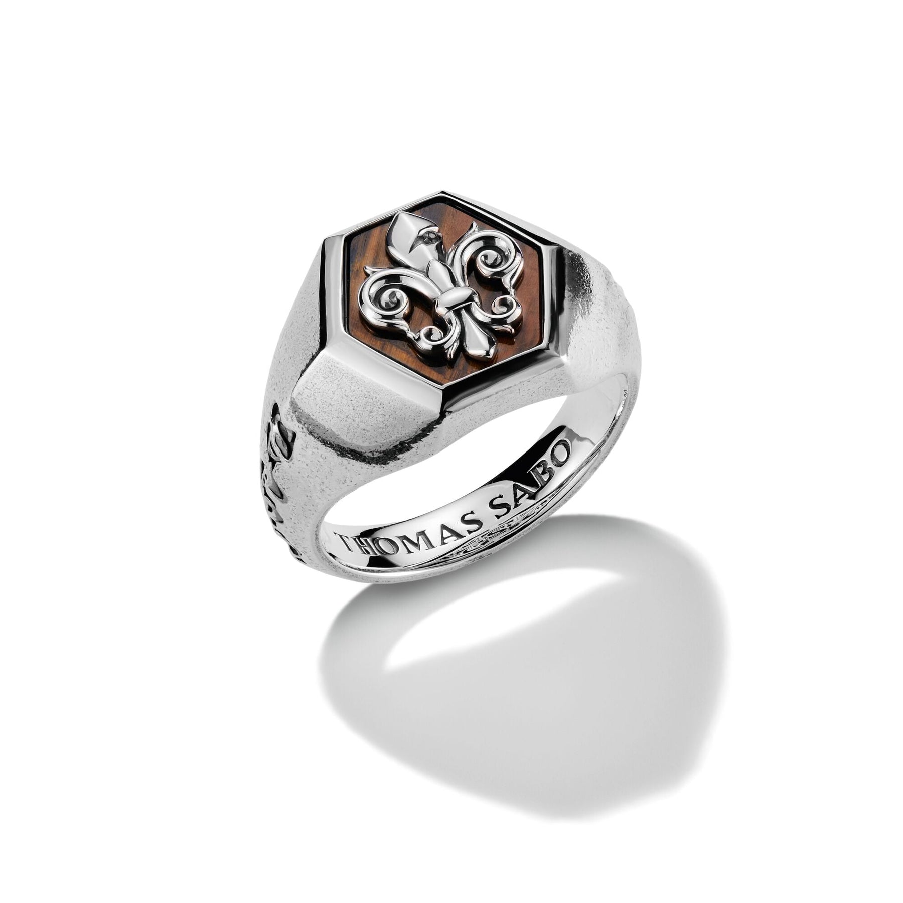 Powerful symbolism meets exquisite materiality: this signet ring features a sculpted lily enthroned on a tiger iron inlay shimmering in gold-blue. The blackened silver surface with a rough finish and the THOMAS SABO logo embedded in the ring band emphasise the rebellious character of the design. A statement piece that powerfully combines history and the present.